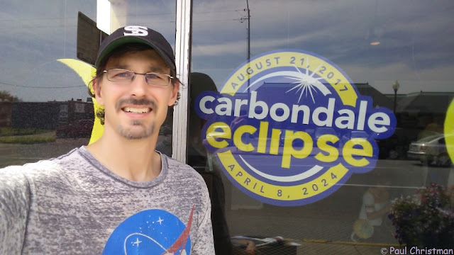 I was not having much luck with my search for postcards when a chance encounter outside a shopping mall led me to the Carbondale Tourism office. The tourism office had postcards and Carbondale eclipse glasses (more on that later) for sale, as well as free eclipse related handouts and brochures. When the lady in the office saw Dawn and Dalton waiting outside in the heat, she said, "Bring that sweet puppy inside." Everybody was so nice, and I took several selfies at what felt like the Carbondale eclipse headquarters. We walked down the street, checked out some of the vendors, but since I had fulfilled my main reason for coming into town, we were eager to get back in the air conditioned car.